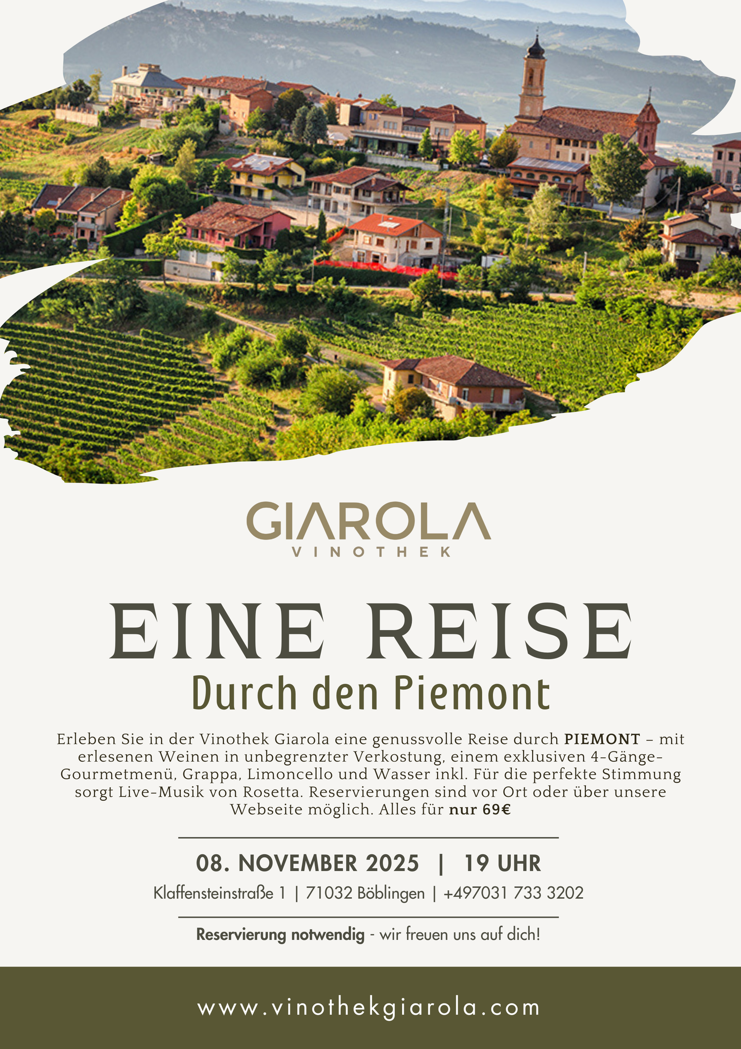 Erleben Sie in der Vinothek Giarola eine genussvolle Reise durch den Piemont - mit erlesenen Weinen in unbegrenzter Verkostung, einem exklusiven 4-Gänge-Gourmetmenü, Grappa, Limoncello und Wasser inkl. Für die pertekte Stimmung sorgt Live-Musik von Rosetta. Reservierungen sind vor Ort oder über unsere Webseite möglich. Alles für nur 69€